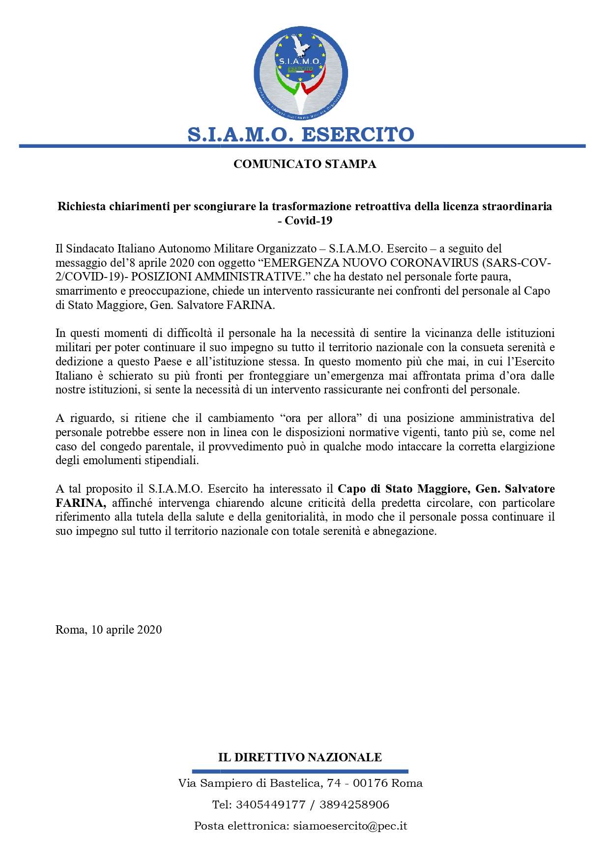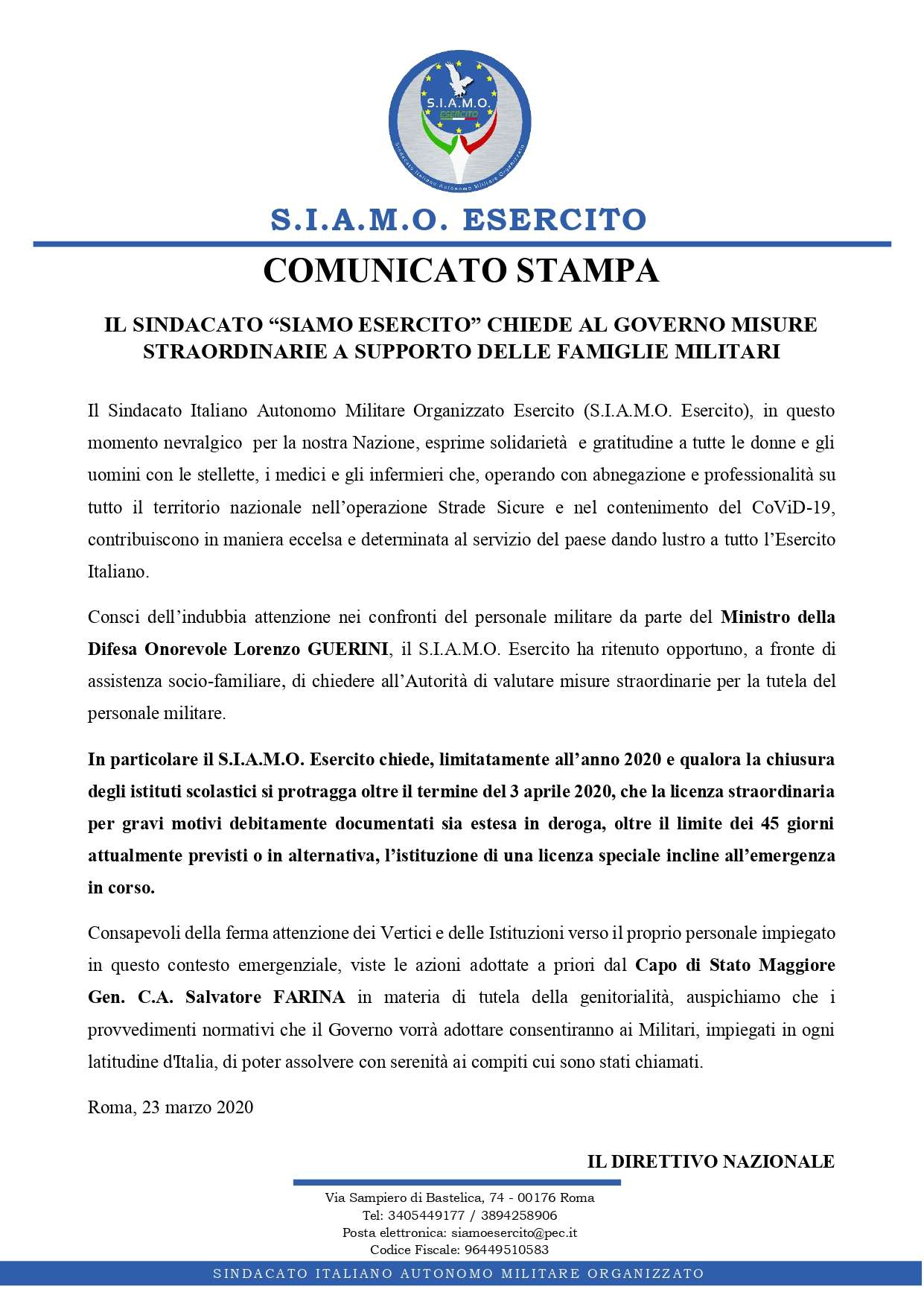 IL S.I.A.M.O. ESERCITO CHIEDE AL GOVERNO MISURE STRAORDINARIE A SUPPORTO DELLE FAMIGLIE MILITARI